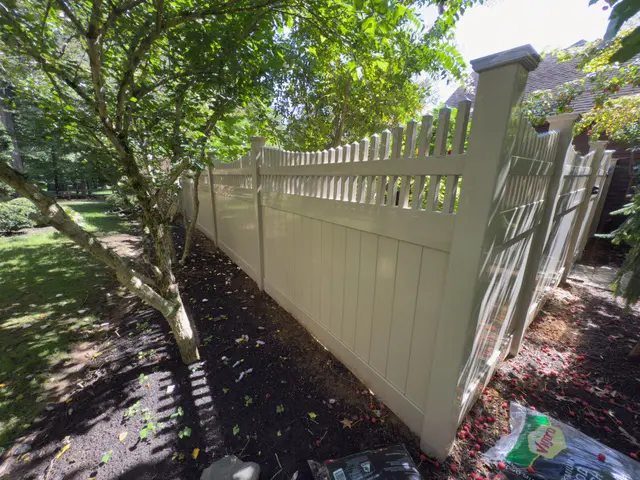 Add-A-Link Fence recently completed this beautiful 6-foot-tall tan PVC fence installation in Middletown, New Jersey, featuring a concave spindle-top design that perfectly combines privacy, elegance, and architectural style.